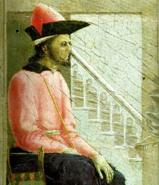 Piero della Francesca: ‘Flagellation of Christ’, 1458-60, Tempera on Panel, 58 x 81 cm. Galleria Nazional delle Marche, Urbino. Detail: seated figure.