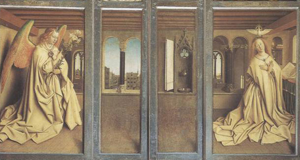 van Eyck: ‘The Ghent Altarpiece (closed)’ tempera and oil on panel, 3.5 x 4.6 m (closed panels), Cathedral of Saint Bavo, Ghent, Belgium,